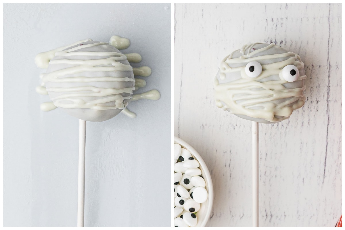 - Una volta che tutte le mummie sono state fatte in questo modo, prendi la glassa rimanente nella busta e posiziona dei piccoli punti dove saranno gli occhi. Posiziona rapidamente un bulbo oculare di caramelle in cima. La glassa/rivestimento fisserà e manterrà il bulbo oculare in posizione. Questo completa le mummie.