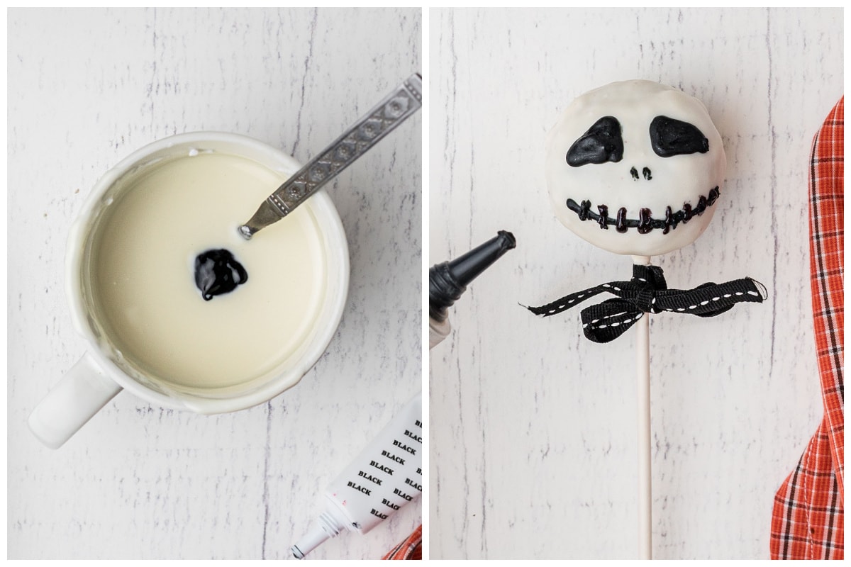 - Decora il volto di Jack Skellington usando la glassa di colore nero. Mettere nel supporto per cake pop.