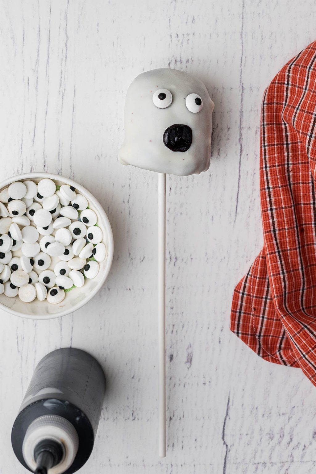- Con la glassa rimanente, posiziona 2 punti dove saranno gli occhi e posiziona rapidamente un bulbo oculare di caramelle sopra ciascuno.