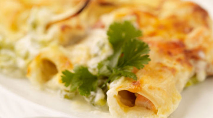 Saltate rapidamente in padella per due minuti i gamberi in un filo d’olio con l’erba cipollina; conservatene a parte alcuni per la decorazione e tritate i restanti. In una ciotola ponete la ricotta, il formaggio grattugiato, i gamberi tritati, poi mescolate e controllate di sale e di pepe. In una casseruola sciogliete il burro. Fuori dal fuoco aggiungete la farina, mescolate con una frusta e diluite con il latte. Ponete la casseruola sul fuoco a fiamma moderata e, senza smettere di mescolare, addensate la salsa. Salate e aromatizzate con il pesto al basilico. Velate il fondo della teglia con un poco di besciamella. Farcite i cannelloni con il ripieno, poi disponeteli nella teglia. Ricoprite con la besciamella. Infornate a 180°C per 25/30 minuti.