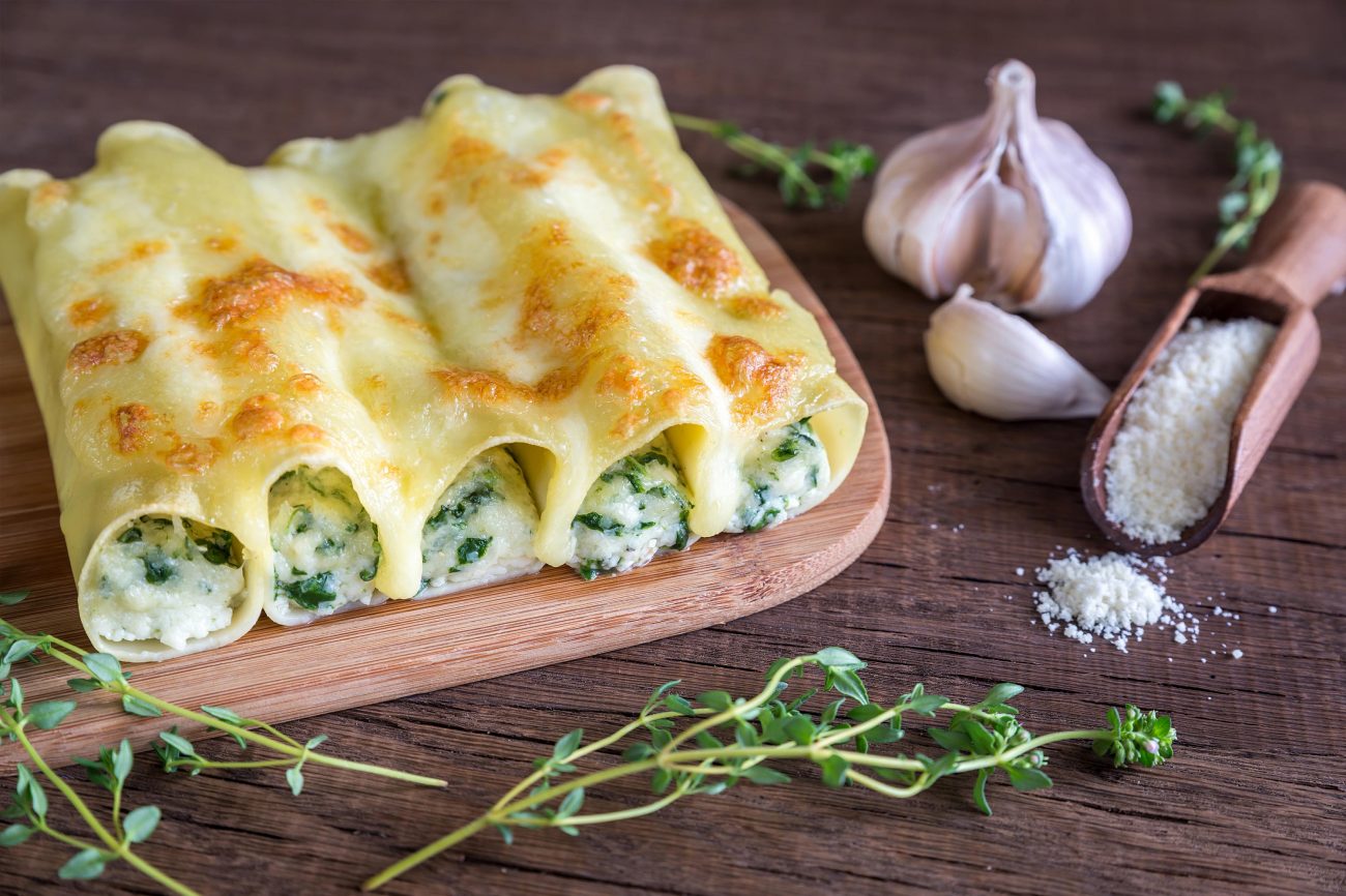 Pulite e lavate gli spinaci più volte; strizzateli e tritateli insieme alla carne (potete utilizzare carne avanzata) e al prosciutto. Trasferite in una terrina, unite l’uovo, un pizzico di noce moscata, il parmigiano reggiano grattugiato, una presa di sale e mescolate per qualche minuto. Fate cuocere i quadrati di pasta in abbondante acqua salata, con l’aggiunta di qualche cucchiaio d’olio, e scolateli al dente. Distribuite il ripieno sulla pasta, che avrete fatto raffreddare, arrotolate e disponete i cannelloni in una pirofila appena unta di burro. Preparate una tazza di besciamella e versatela sui cannelloni, spolverizzate con parmigiano reggiano grattugiato e fate gratinare in forno a 200°C.