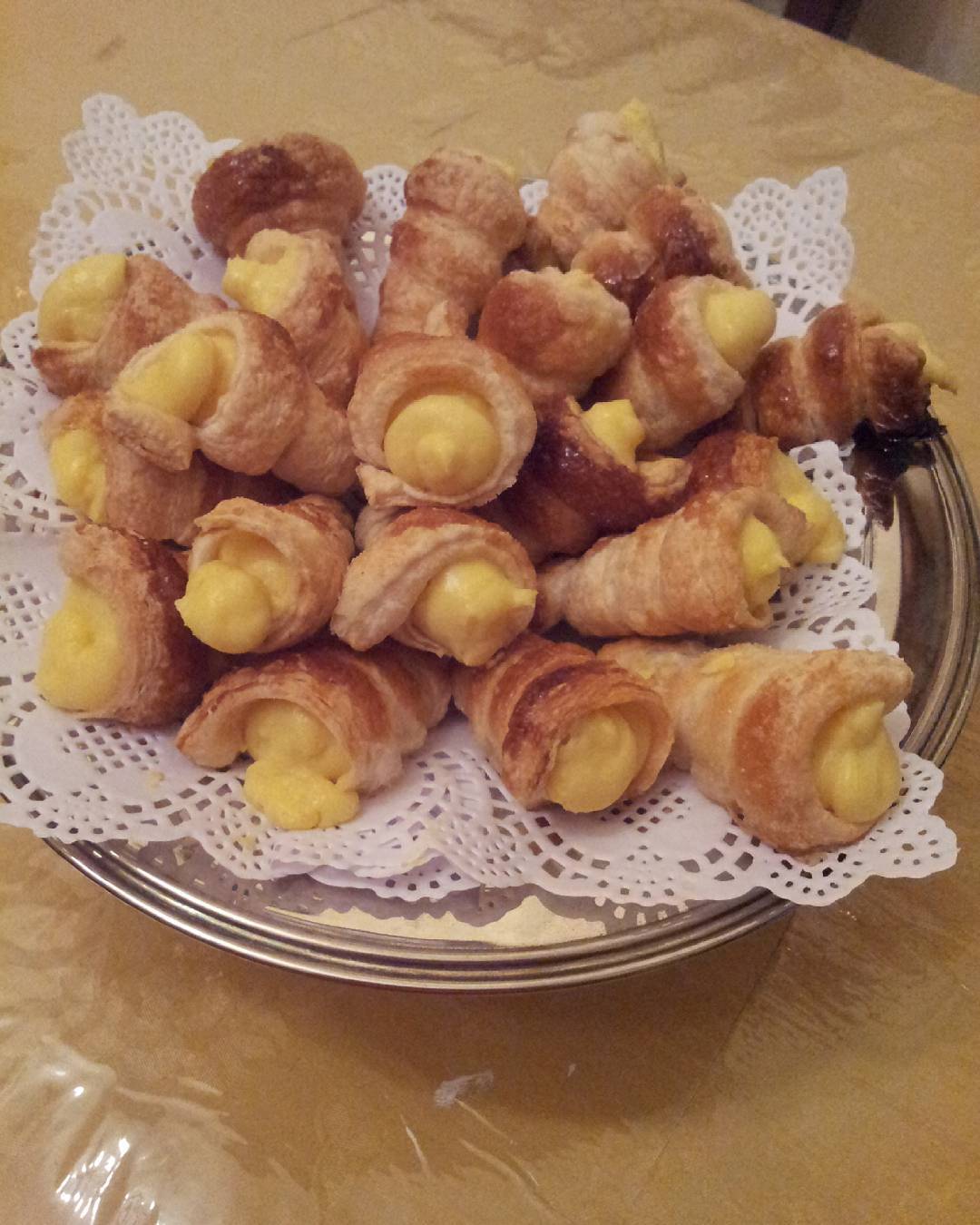 Per servire i cannoncini, levate la crema dal frigo, mescolate con una spatola e aggiungete la panna montata, riempite i cannoncini con una tasca da pasticcere; guarnite a piacere.