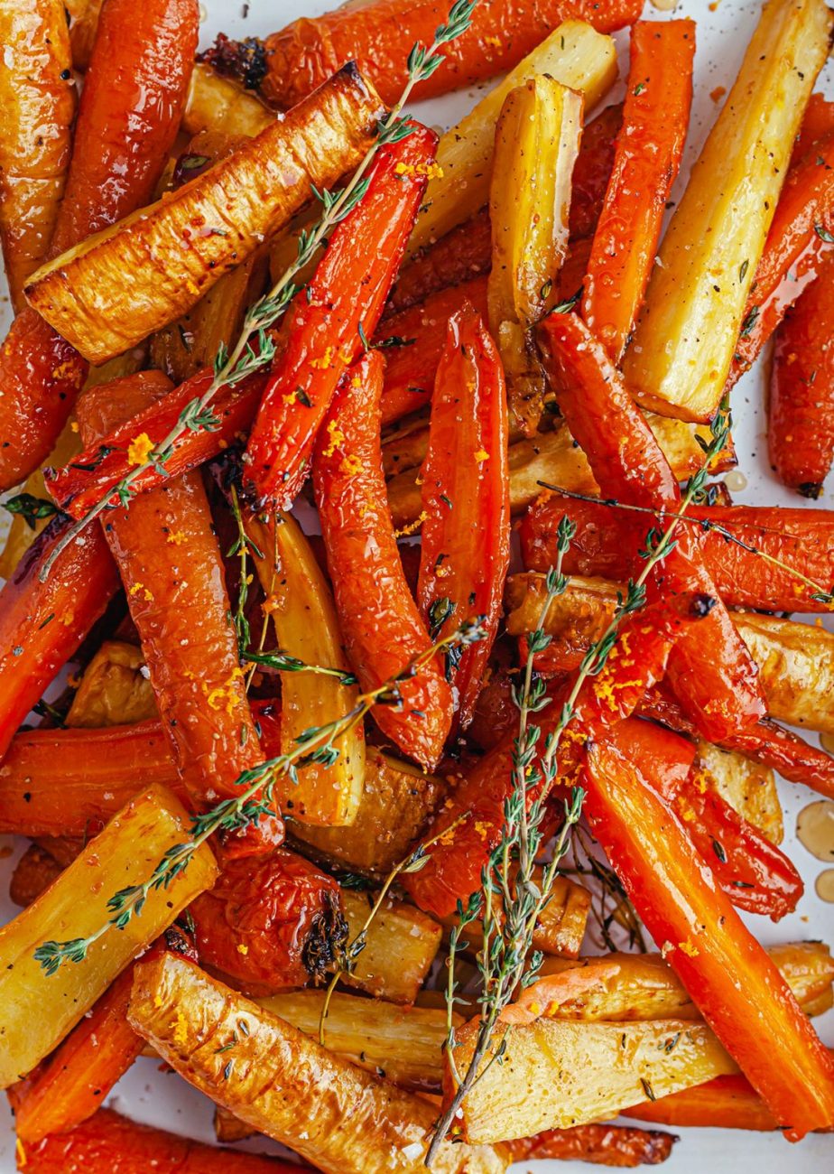 Carote e pastinache arrostite a pezzi grossi senza fronzoli, che arrostiamo con succo e scorza d’arancia, così come timo fresco.