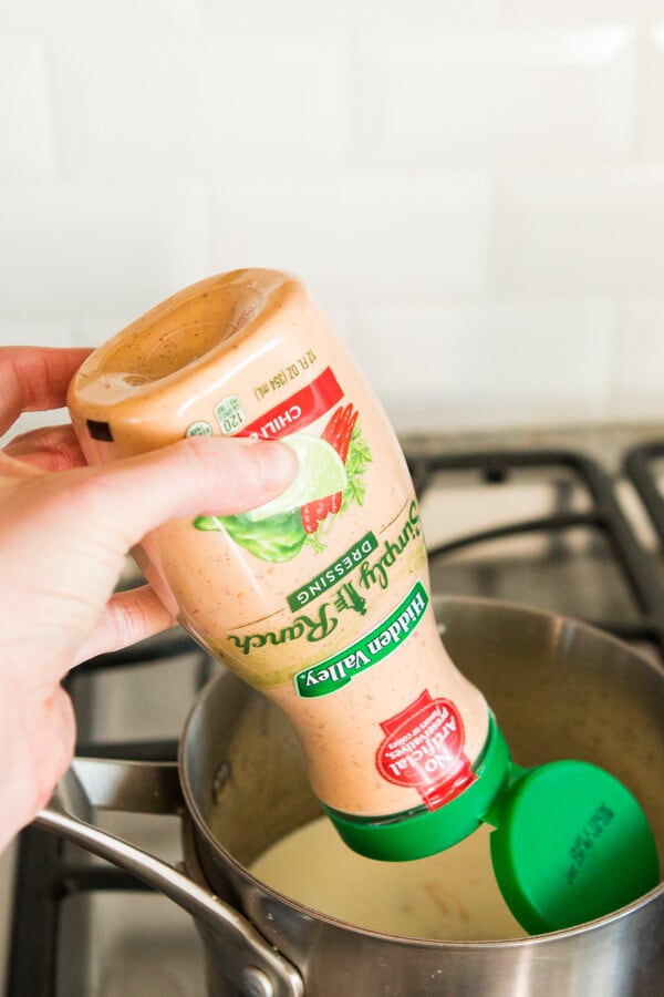 Aggiungere immediatamente il liquido continuando a sbattere. Questa è un’ottima occasione per tirare fuori il tuo condimento ranch: abbiamo usato il sapore di peperoncino e lime ed è fantastico, ma c’è anche il basilico classico e cetriolo se vuoi provare qualcosa di meno piccante).