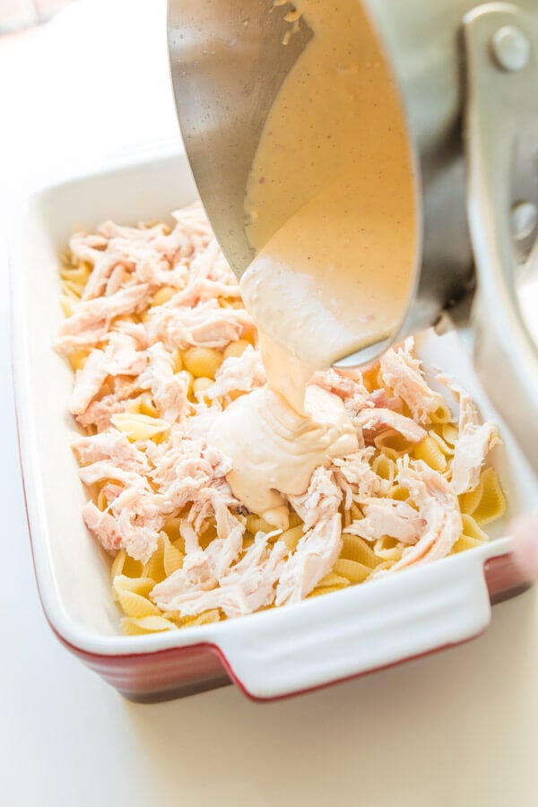 Devi anche assicurarti di scolare molto bene la pasta prima di aggiungerla alla casseruola. Se è rimasta troppa acqua sulla pasta, la salsa alla crema ranch si diluirà, il che non è quello che vuoi.