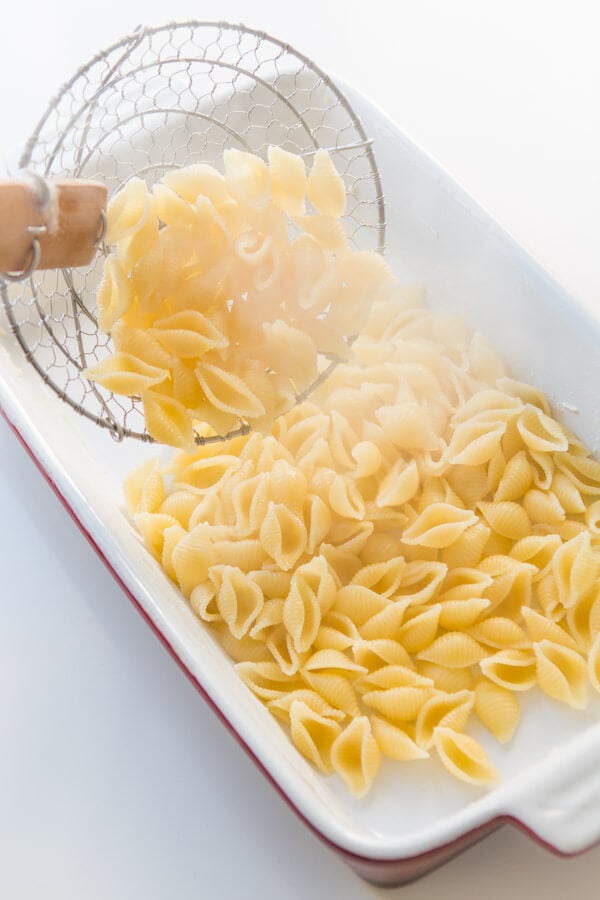 Quando cuoci i gusci di pasta, assicurati di salare l’acqua prima di aggiungervi la pasta secca. Vuoi che la pasta stessa abbia un po’ di sapore, altrimenti questa casseruola per ranch di pollo avrà un sapore un po’ piatto.