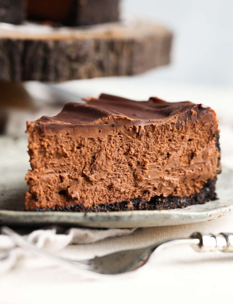 Fate sciogliere il burro in un pentolino il burro. Tritate finemente i biscotti al cacao con un mixer ed uniteli al burro precedentemente sciolto. Amalgamate per bene il tutto creando un composto omogeneo. Rivestite uno stampo da 22 cm di diametro a cerchio apribile con della carta forno. Ritagliate anche delle strisce per il cerchio. Versate il composto di biscotti e compattate bene la base con il dorso di un cucchiaio. Riponete in frigorifero per 30 minuti. Sciogliete il cioccolato fondente a bagnomaria, fate raffreddare e mettete da parte. Montate con le fruste la panna liquida fresca (non deve essere a neve ferma, ma montata leggermente). Se invece usate il mascarpone ammorbiditelo insieme al formaggio Philadelphia. Ammorbidite il formaggio Philadelphia insieme allo zucchero semolato, azionate le fruste ad una velocità media. Aggiungete un uovo alla volta ed amalgamate il tutto sempre con le fruste. Aggiungete il cioccolato fondente, l’amido di mais ed il cacao amaro. Mescolate di nuovo il tutto fino ad ottenere una crema omogenea. Versate il ripieno sulla base di biscotto e cuocete a 170°-180°C per circa 50-60 minuti. Sfornate fate raffreddare per bene e riponete in frigorifero per almeno 8-10 ore. Estraetela dalla teglia, decorate a piacere e servite.