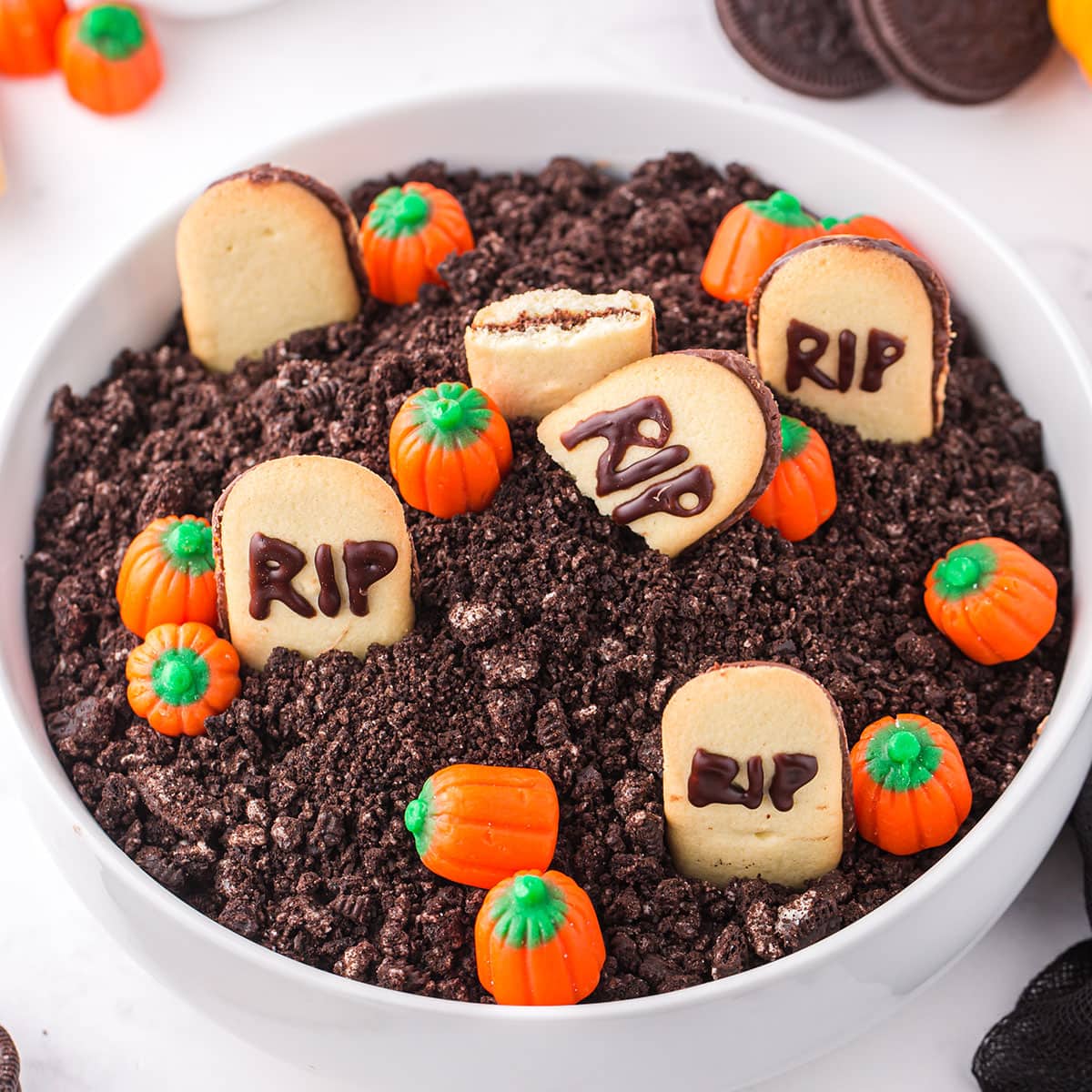 La base di questa salsa è una salsa al cioccolato liscia e cremosa che ha il sapore di una combinazione paradisiaca d’impasto di brownie e cheesecake al cioccolato. Gli Oreo schiacciati creano l’aspetto dello sporco “cimitero” e i biscotti Milano con una manciata di caramelle aggiungono alla scena festiva.
