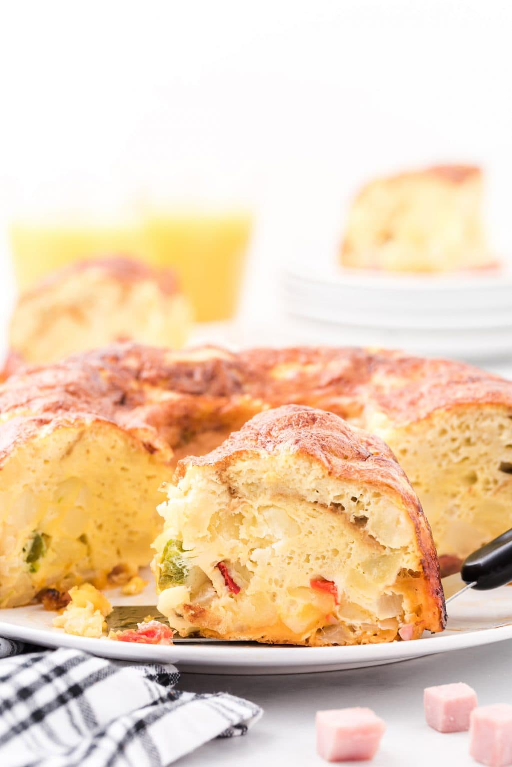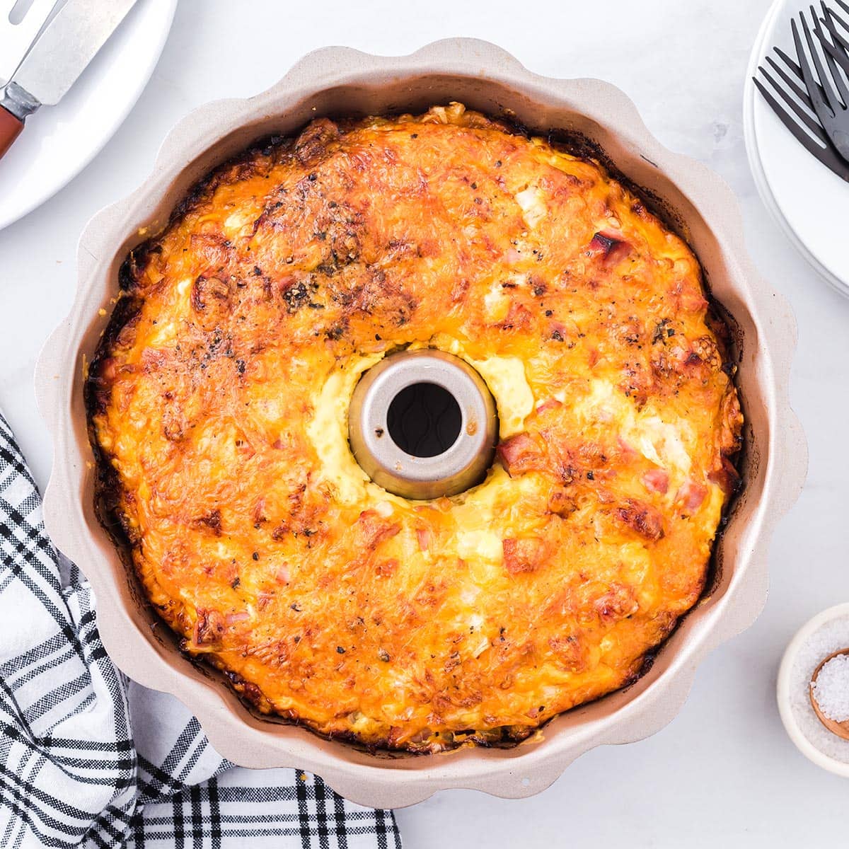 Questa ricetta della ciambella per la colazione è un nuovo modo per preparare una colazione deliziosa e salata. La combinazione di uova, patate, formaggio, prosciutto e verdure cotte in una teglia per ciambelle rende un piatto per la colazione facile che sembra così bello.