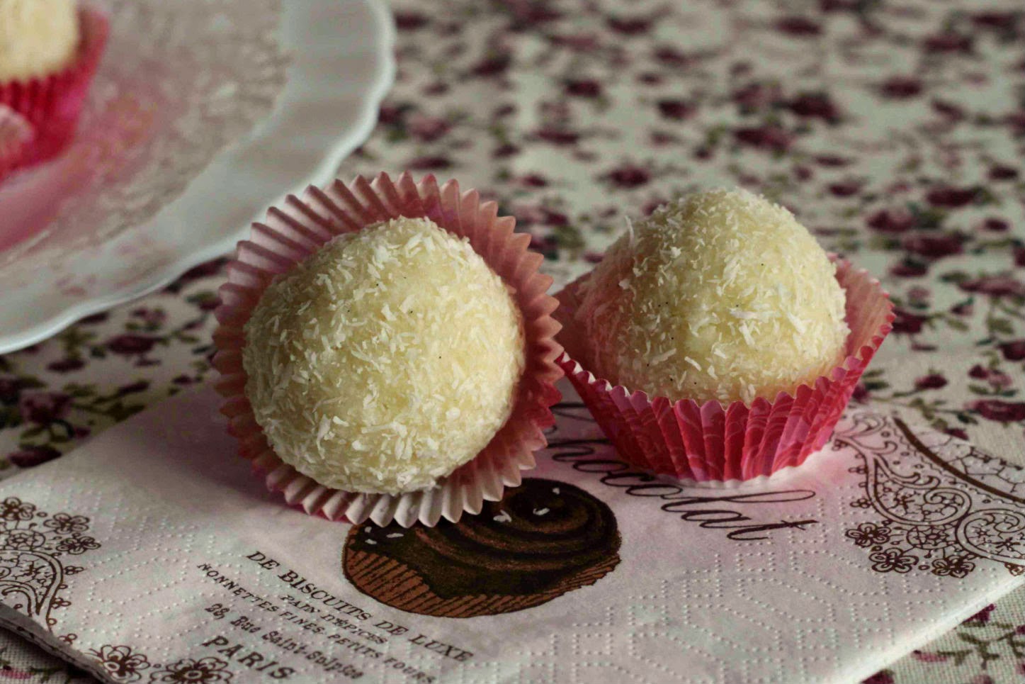 Fate bollire la panna in un pentolino, aggiungete il cioccolato bianco e fate sciogliere fino a quando il miscuglio è liscio senza grumi, fate raffreddare completamente, sbattete con lo sbattitore elettrico fino a quando il miscuglio è bello gonfio e sodo, prendete con un cucchiaino un po di miscuglio e mettete una nocciola nel centro, fate delle palline e mettete su una teglia coperta con carta da forno, continuate cosi’ fino a quando avete usato tutto il composto, passate le cialde alla vaniglia nel mixer e riducete a briciole, passate i cioccolatini nelle briciole; mettete in frigo per almeno un’ora; fate sciogliere il resto del cioccolato bianco a bagno maria, immergete i cioccolatini e poi passate nei fiocchi cocco, mettete in frigo fino a quando i cioccolatini si sono asciugati.