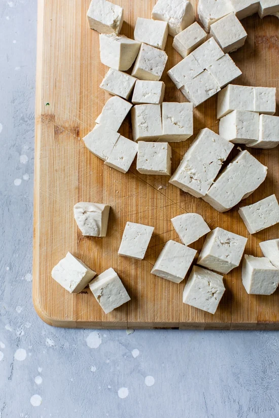 La cosa più importante da fare per garantire un tofu croccante è spremere tutto il liquido! Per togliere tutta l’acqua dal tofu prima della cottura, basta metterlo tra alcuni tovaglioli di carta o strofinacci e premere per far uscire l’acqua.