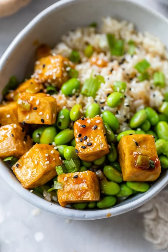 - Qui, ho servito queste ciotole di tofu croccanti con riso integrale ed edamame per più proteine, ma anche il riso al cavolfiore o le verdure saltate in padella sarebbero ottimi.