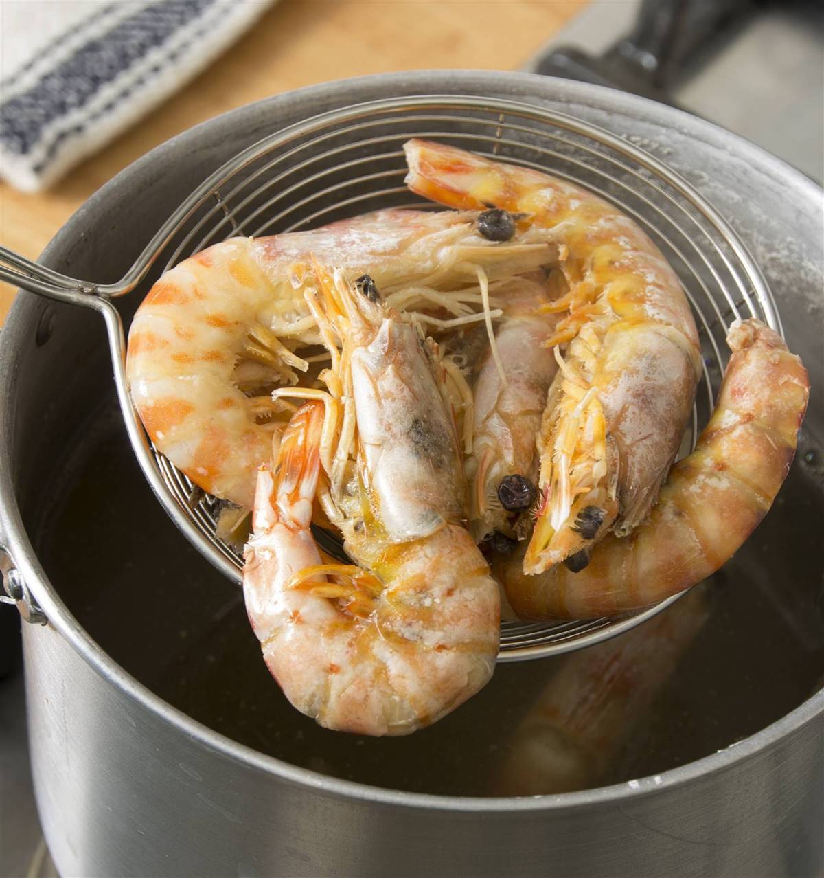 Quando l’acqua inizia a bollire, aggiungere i gamberi. Quando l’acqua raggiunge di nuovo il bollore e cuocete per 2 min (dipende dalla grandezza), fino a quando non cambiano colore. Più grandi sono i gamberi, più tempo dovrai lasciarli.