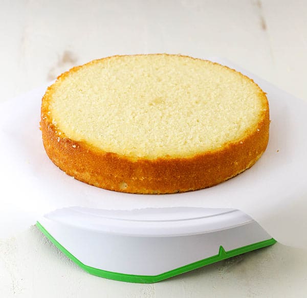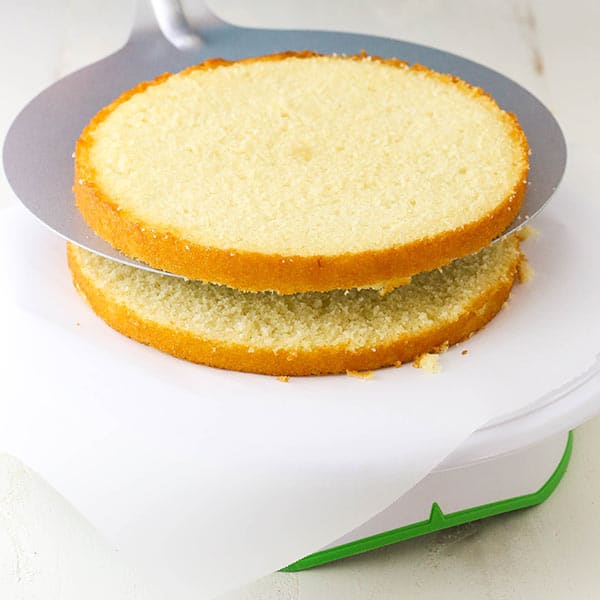 Una volta effettuato il taglio, rimuovere lo strato superiore in modo da avere i due strati. Ho un sollevatore per torta che mi piace usare. Rende davvero facile da maneggiare sottili, teneri strati di torta.