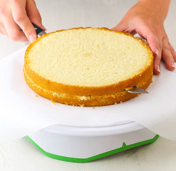 Anche se può sembrare un passaggio inutile, è importante avere strati di torta livellati per garantire la stabilità della torta. Una torta a cupola che viene impilata con un’altra torta a cupola può alla fine esercitare troppa pressione sul centro della torta, facendola rompere proprio al centro.