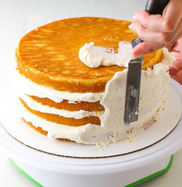 Se stai solo aggiungendo uno strato di crema di burro tra gli strati di torta, la glassa può avere una consistenza più sottile e tenere insieme bene. Tendo ad aggiungere circa 1 tazza di glassa tra i miei strati di torta da 20 cm e distribuirla in uno strato uniforme. Si vuole essere sicuri che sia bello e pari/livello. Una delle chiavi di una torta che non oscilla sono anche gli strati.