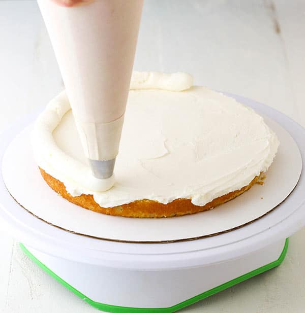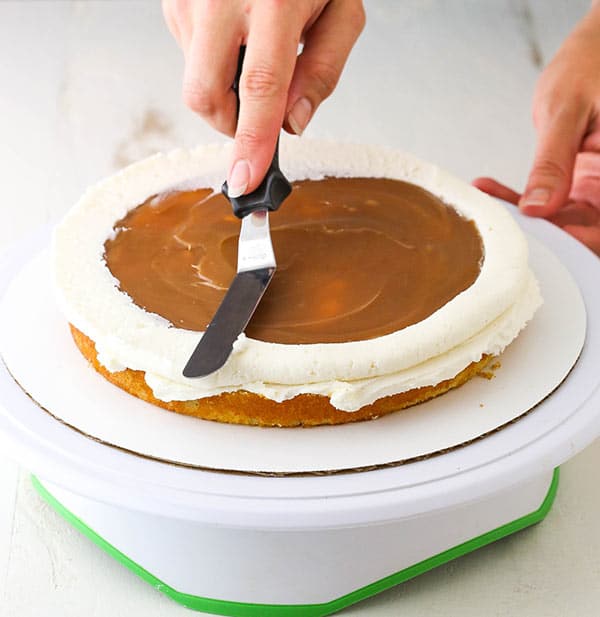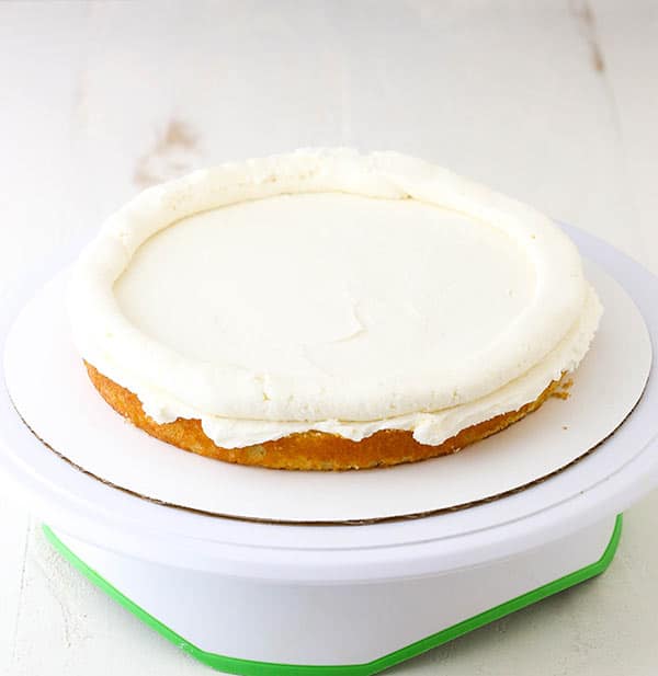 Prima di aggiungere lo strato successivo di torta, assicurarsi che lo strato di ripieno sia livellato. Se la diga è più alta del ripieno (che la mia di solito è), utilizzare la spatola offset per aggirare il bordo esterno/la diga e lisciare la glassa in modo che sia in piano con il ripieno.