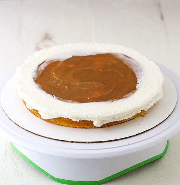 Per questa torta, stavo aggiungendo due ripieni in uno così ho iniziato con solo 1/2 tazza di glassa. Aggiungere la glassa allo strato della torta e distribuire uniformemente, consentendo ad alcuni di pendere sui bordi della torta.