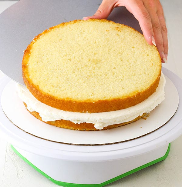 Aggiungere lo strato successivo di torta. Mi piace usare il sollevatore per torta per strati di torta più sottili per assicurarmi che non si rompano.