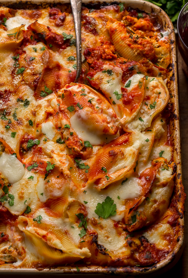 E oggi facciamo un classico tutto italiano: conchiglie ripiene! In realtà vi ho intervistato su Instagram la scorsa settimana chiedendovi se preferite vedere ziti al forno o conchiglie di pasta ripiene qui sul blog, e il voto è stato 50/50. Quindi ovviamente ho dovuto fare entrambi! È un lavoro duro…ma qualcuno deve pur farlo