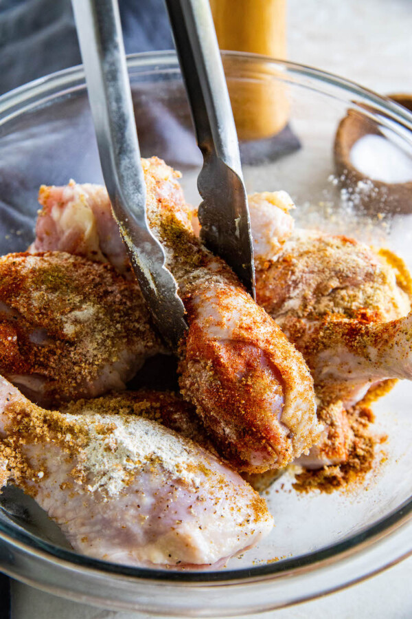- Aggiungi le spezie alla ciotola o al sacchetto e mescola finché ogni coscia di pollo non è ben ricoperta nella miscela.