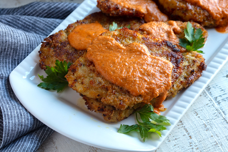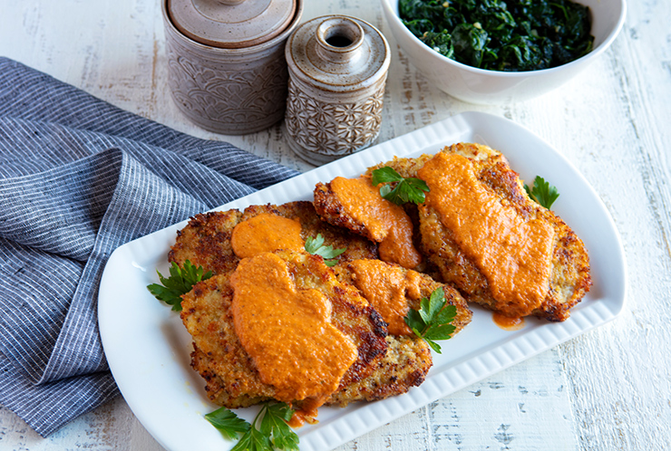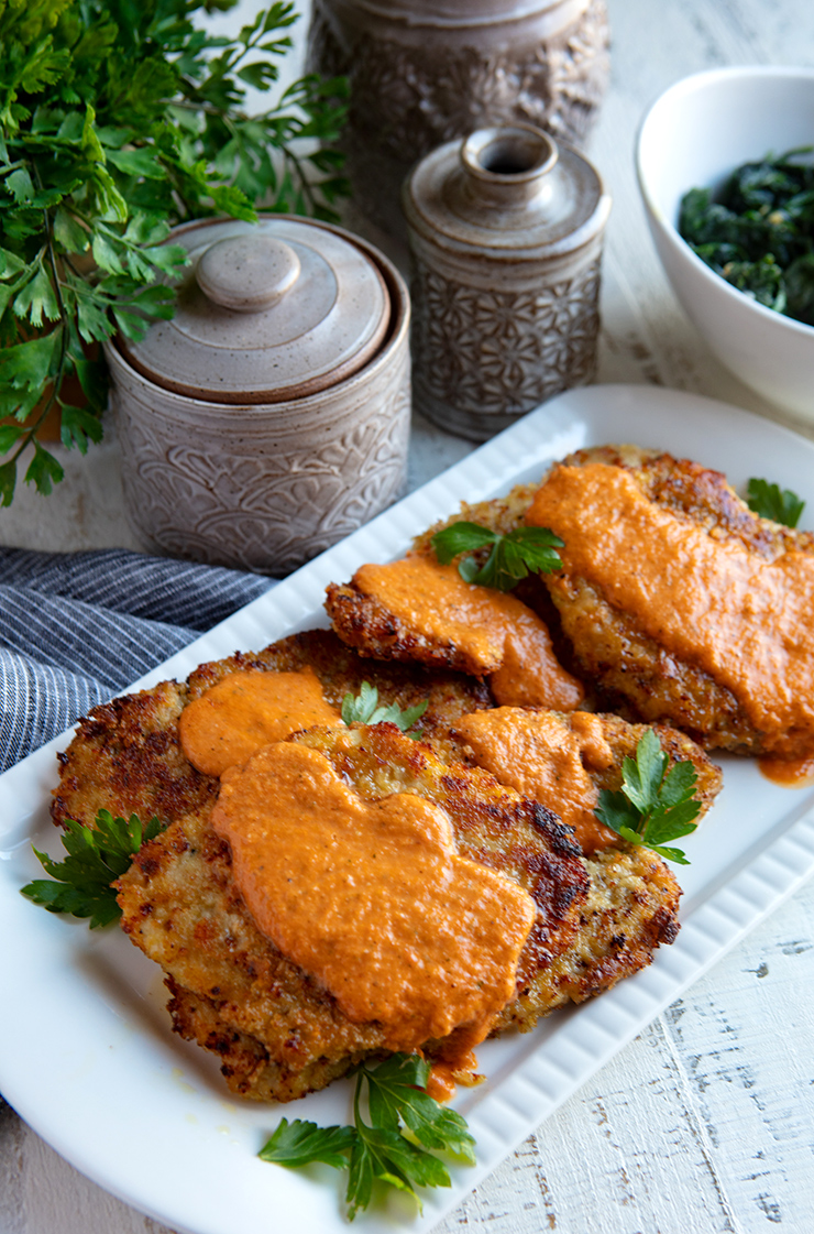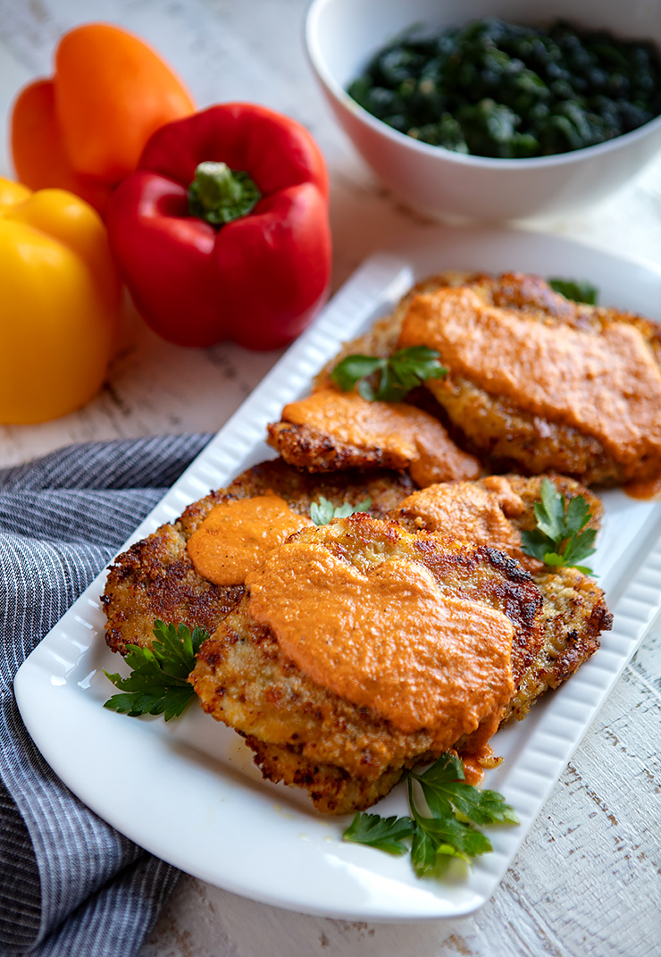 COTOLETTE DI PETTO DI POLLO IN CROSTA DI PARMIGIANO CON SALSA DI PEPE ARROSTO