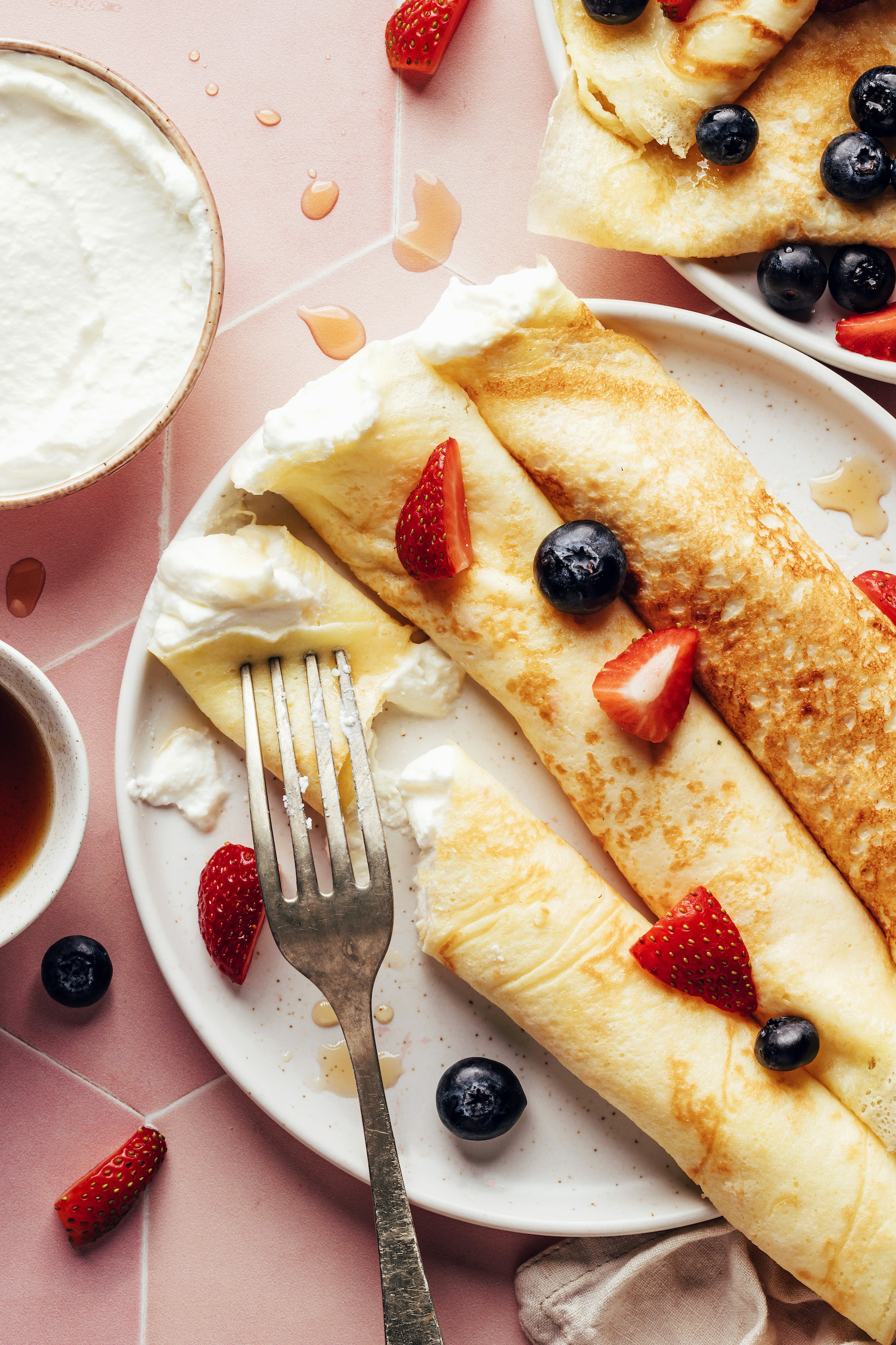 - Servire le crepes calde con frutti di bosco, composta di frutta, frutta fresca, Nutella, panna montata al cocco e/o sciroppo d’acero! Le possibilità sono infinite.
