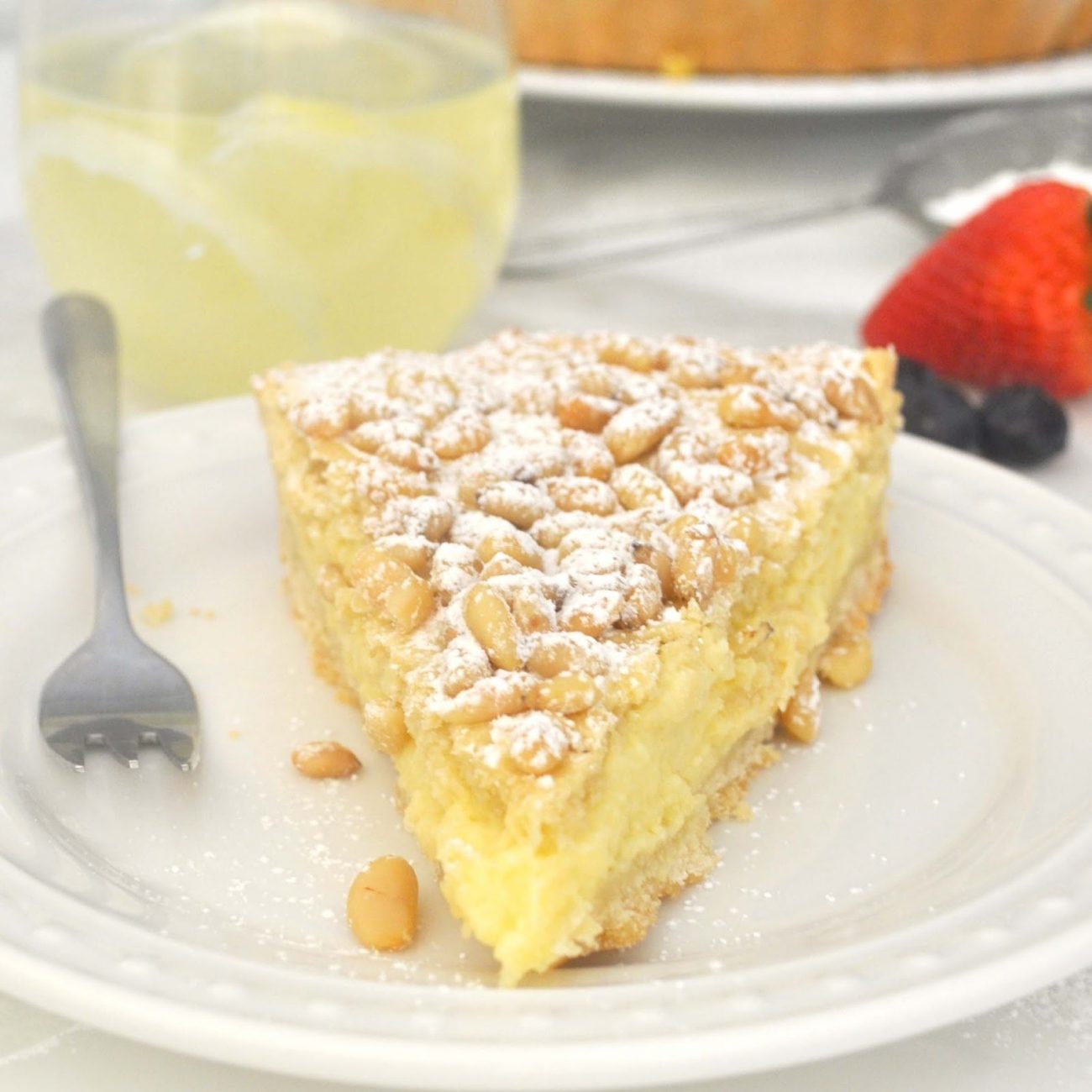 Preparate la crema facendo bollire il latte in un pentolino insieme alla scorza di limone; intanto in una terrina lavorate i tuorli con lo zucchero e la farina, versandola pian piano in modo da amalgamarla bene. Quando il composto diventa omogeneo, sempre mescolando, versate il latte caldo. Versatelo adesso nel pentolino in cui avete fatto bollire il latte e fatelo cuocere a fuoco lento mescolando continuamente fino a quando non avrà raggiunto la consistenza di una crema densa. Dopodiché spegnete il fuoco e lasciate raffreddare. Nel frattempo in una terrina amalgamate con una frusta l’uovo intero, il tuorlo, lo zucchero e un pizzico di sale, unite poi la farina, il lievito e il burro tagliato a pezzetti e a temperatura ambiente e lavorate a lungo il composto per legare insieme tutti gli ingredienti; dopodiché fatelo riposare in frigorifero coperto da una pellicola trasparente per circa mezzora. Trascorsa la mezzora stendete l’impasto e mettetelo su una teglia da crostata, versate all’interno la crema, cospargete la superficie di pinoli e lasciate cuocere in forno preriscaldato a 180°C per circa 40 minuti.