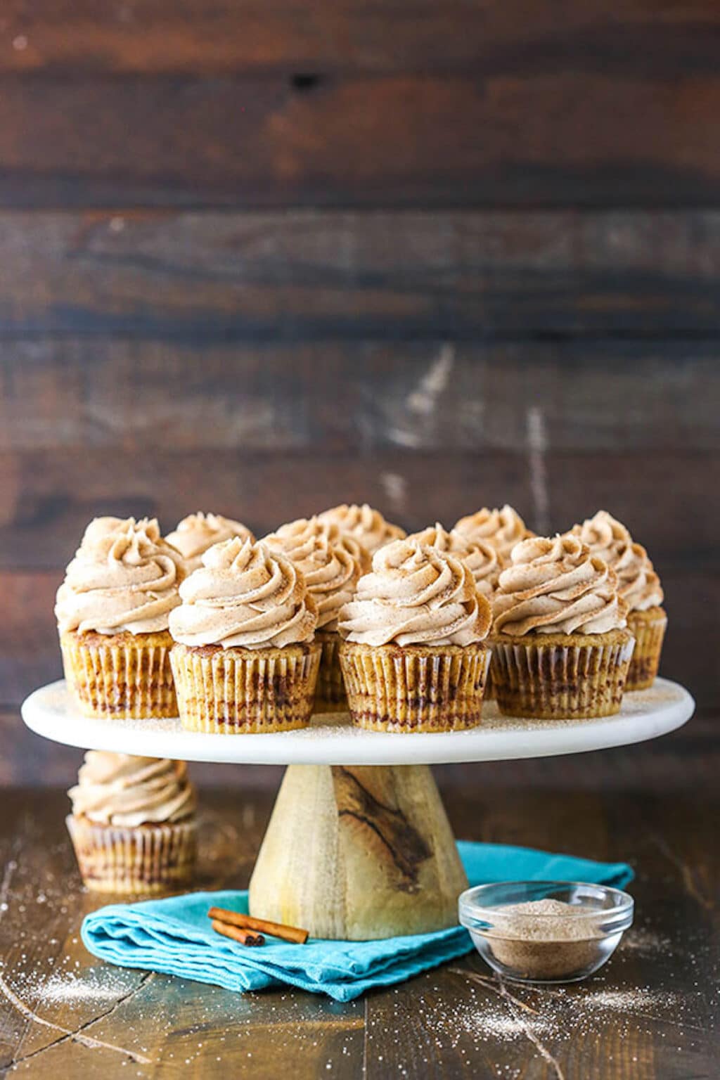 - Infilare la glassa sui cupcakes e cospargere con l’eventuale residuo di zucchero cannella. Tieni presente che lo zucchero alla cannella in cima assorbirà l’umidità mentre i cupcakes si siedono, quindi se vuoi l’aspetto ovvio dello zucchero alla cannella che vedi nelle foto, ti consigliamo di aggiungerlo appena prima di servire