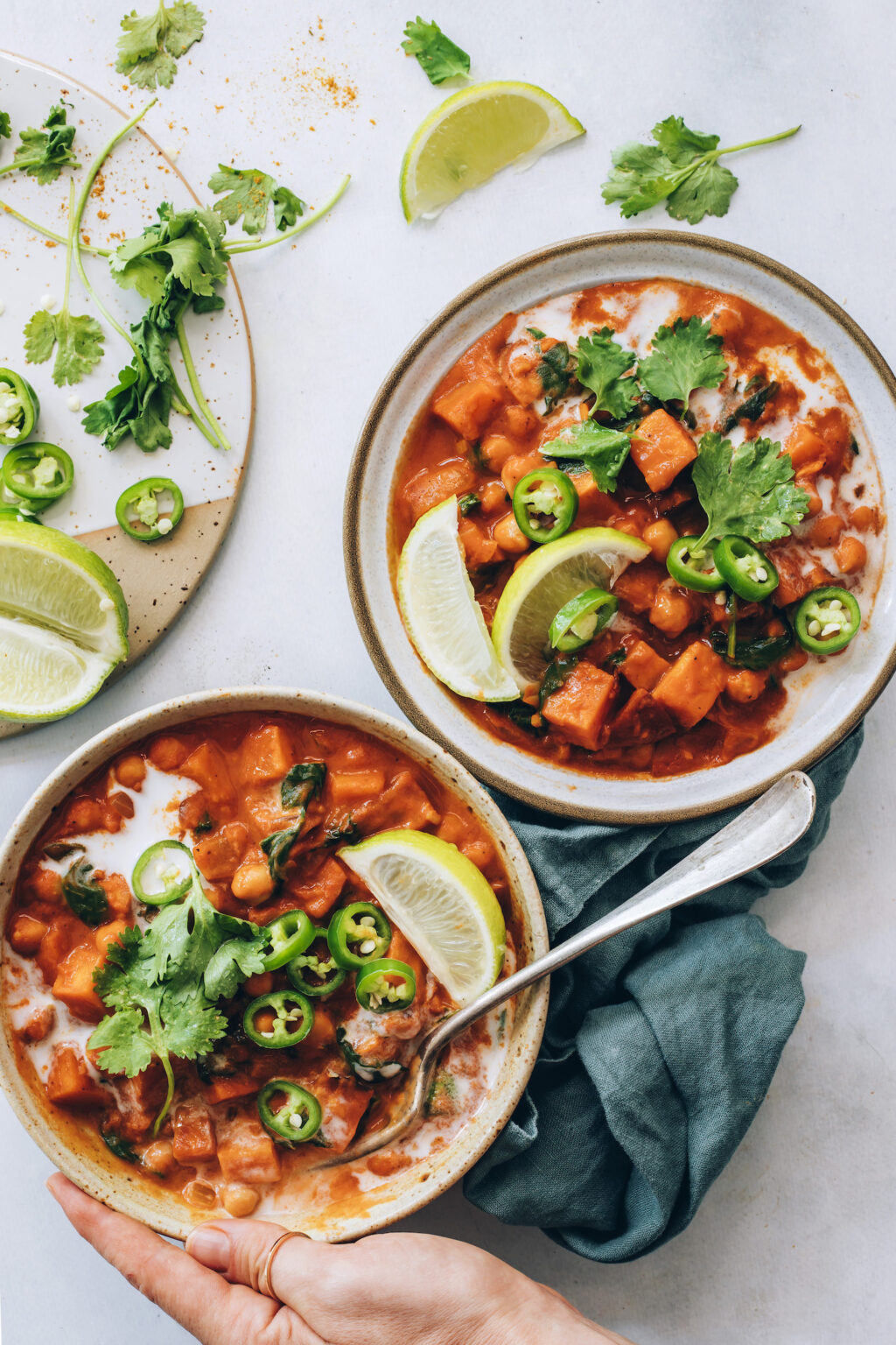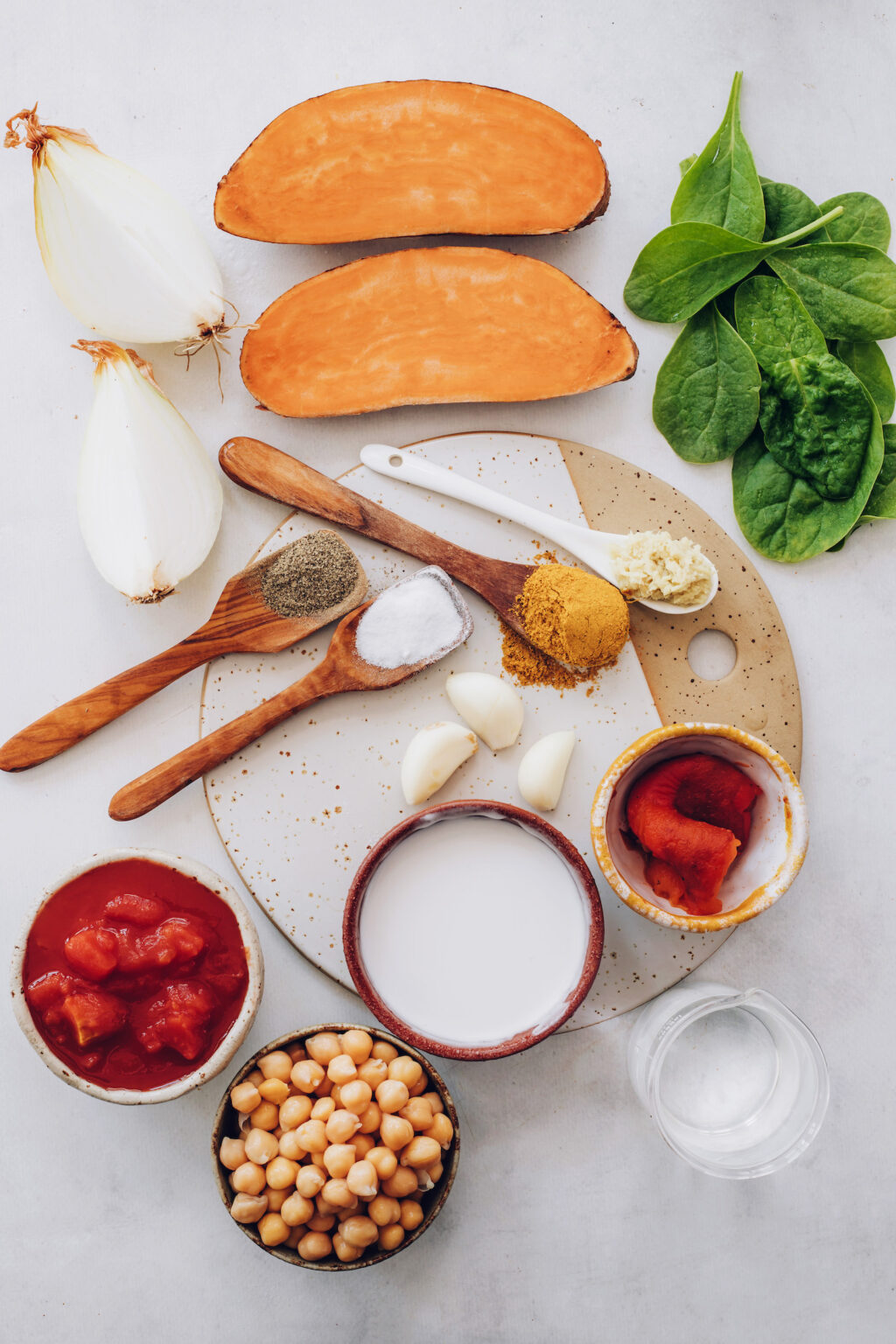 I peperoni rossi arrostiti (fai da te o facili da preparare in un barattolo) vengono mescolati con pomodori piccanti, latte di cocco cremoso e spezie riscaldanti per creare la salsa perfetta da abbinare a tenere patate dolci e ceci sostanziosi. Aggiungi degli spinaci e avrai un piatto nutriente e soddisfacente, perfetto per i giorni feriali, per la preparazione dei pasti o per sfamare una folla! Anche meglio? Servono solo 10 ingredienti. Lascia che ti mostriamo come è fatto!