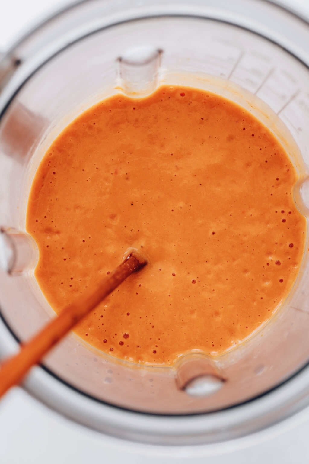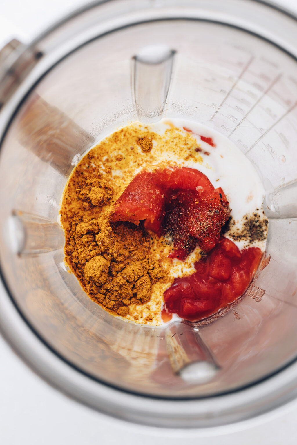 - In un frullatore ad alta velocità, aggiungi peperoni rossi arrostiti, pomodori a cubetti, latte di cocco, curry in polvere, sale e pepe (opzionale). Frullare in alto fino a che liscio e cremoso. Accantonare.