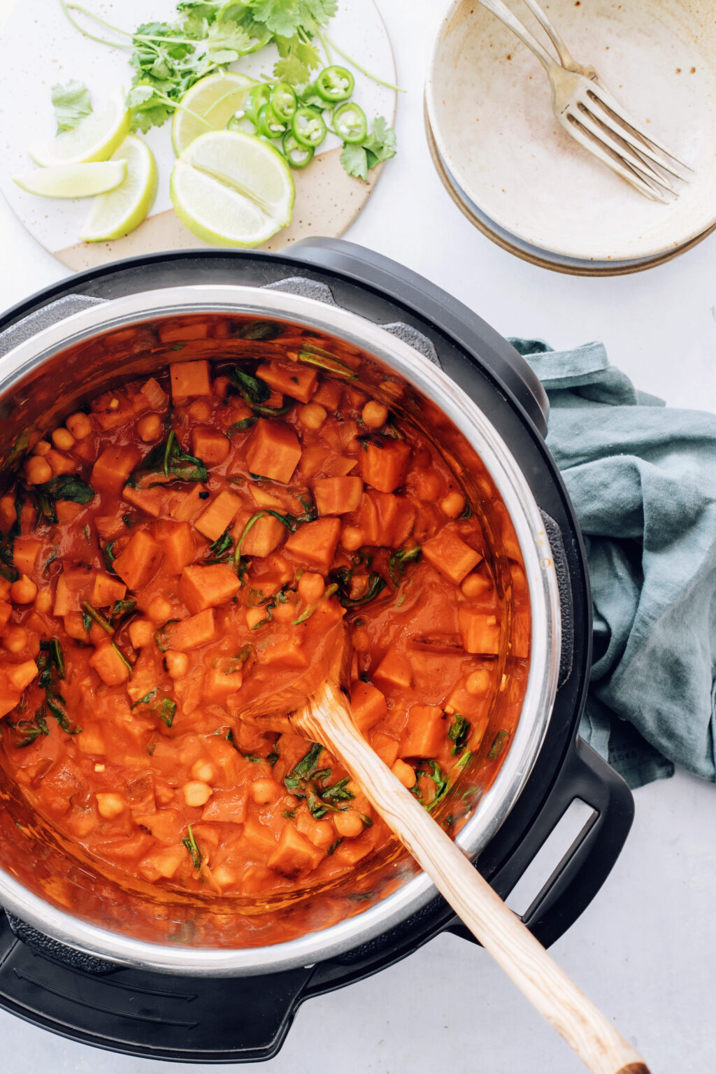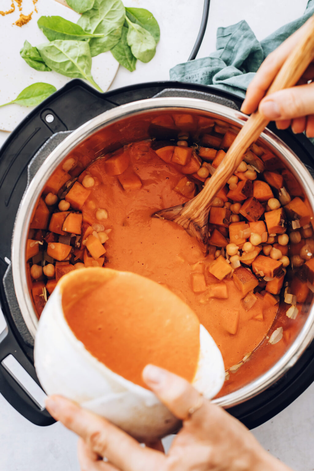Con entrambi i metodi, soffriggere la cipolla, le patate dolci, l’aglio e lo zenzero, quindi aggiungere i ceci e la salsa di peperoni arrostiti. Dopo aver sigillato il coperchio della pentola istantanea, il curry cuoce a pressione per soli 2 minuti. Sì, intendiamo DUE. Non è un errore, amici. Ti abbiamo detto che la pentola istantanea è stata veloce!