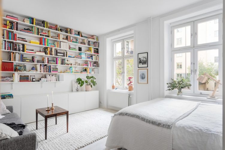 Una serie di mensole poco costose, che si estendono per tutta la lunghezza della parete e fino al soffitto, formano una grande biblioteca con libri accuratamente posizionati, creando un punto di interesse nella decorazione per il suo colore. Sotto i ripiani, una base dal design molto semplice e di colore bianco che funge da cassettiera e spazio per riporre oggetti vari.