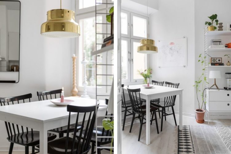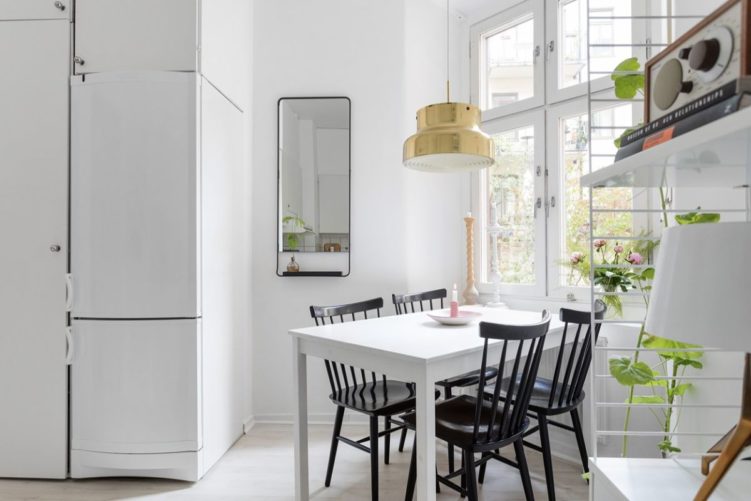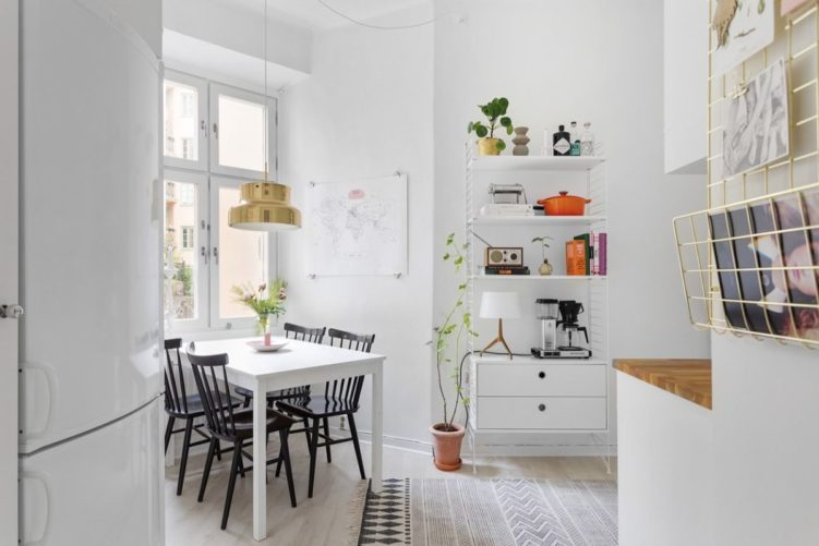 La sala da pranzo è stata installata vicino alla finestra ed è composta da un tavolo rettangolare bianco dal design molto semplice e quattro sedie nere. A lato, un grande mobile che contiene il frigorifero e ingloba lo spazio per riporre gli oggetti. Dall’altro lato una libreria/scaffale nordica con cassetti del marchio String.