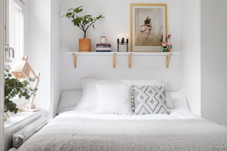 Non c’è spazio per i comodini, ma la base della finestra serve a sostituirlo. Il ripiano sopra il letto finisce a decorare il settore e funge da piano di appoggio per libri e oggetti.