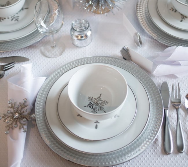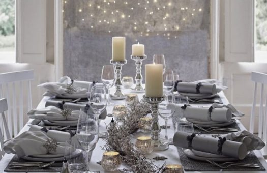 Per iniziare, potremmo posizionare una tovaglia e dei tovaglioli in bianco, quindi aggiungere tocchi in argento, ad esempio con un servizio di posate d’argento, o con ornamenti e accessori.