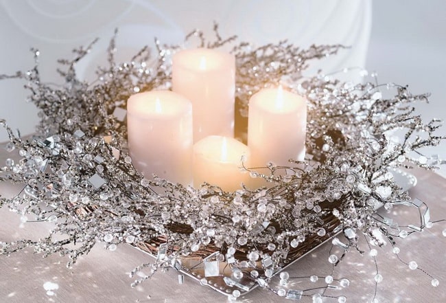 Possiamo anche farli con le cose che abbiamo in casa. Ad esempio, con un vassoio d’argento, una grande candela bianca e delle palline di Natale d’argento, potremmo ottenere un bel centrotavola come quello che vediamo qui sotto: