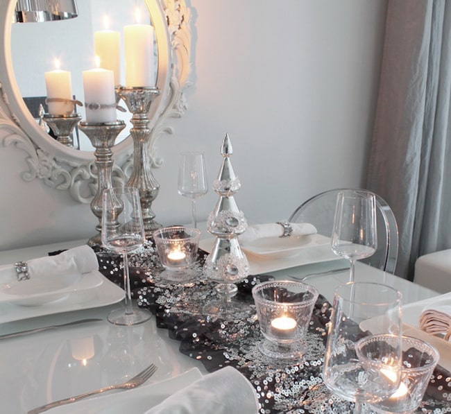 Una risorsa molto interessante per decorare la tavola di Natale è aggiungere un runner da tavola in argento con paillettes. Sarà molto bello abbinato alle stoviglie e ai tovaglioli bianchi. Completato con alcuni ornamenti color argento.