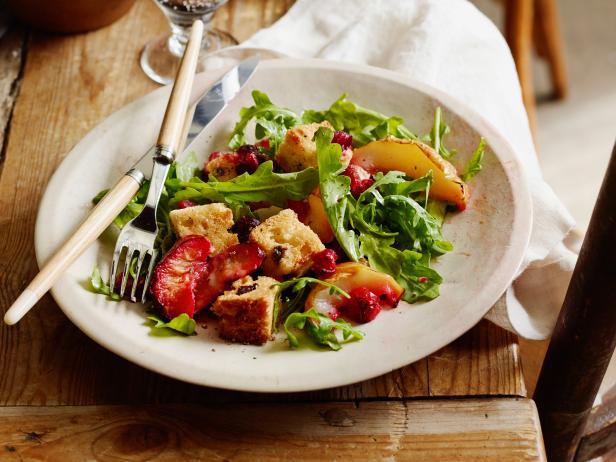 Arugula and roasted fruit salad with panettone croutons