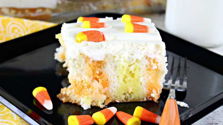 Mix the cake according to the box directions the evenly divide the cake mix into two separate bowls. Using the food coloring, dry one bowl of batter yellow and one orange. Grease a 9×13 baking dish with nonstick spray and spread the yellow cake batter across the bottom. Cover and put the dish in the freezer for 30 minutes. Remove the dish from the freezer and gently pour the orange batter over the yellow and carefully spread it evenly. Bake the cake according to the package directions or until a toothpick inserted comes out clean. It may take a few extra minutes since the cake batter was slightly frozen. Remove the cake from oven and poke holes all over it with the end of a wooden spoon. Pour the sweetened condensed milk evenly into holes and all over the cake. Place the cake in the refrigerator for at least 2 hours. Before serving the cake, evenly spread the whipped cream over it. Top the whipped cream with candy corns.