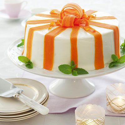 Frost the sides on top of cake. Arrange the carrot ribbons from the bottom to the top, and place a flower ribbon on top. You can prepare the cake in advance and refrigerate up to two days. Let stand at room temperature for a few minutes before serving and garnish with mint springs.