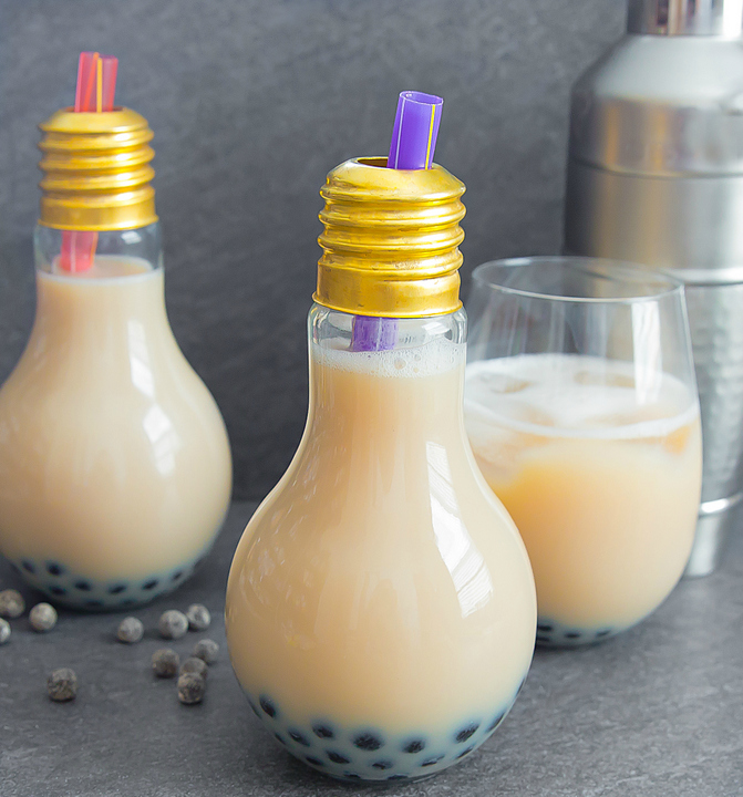 Make the tea, using the hot water and leave to brew for 5 minutes. Before removing the bags give them a squeeze to release the full flavor. Now mix in the milk with the sweetener. Place ice in a tall glass and add the tea. Place the juice on top, then add 3 tablespoons of tapioca. If wanted, you can add cream to the top. Dish up with a large straw.