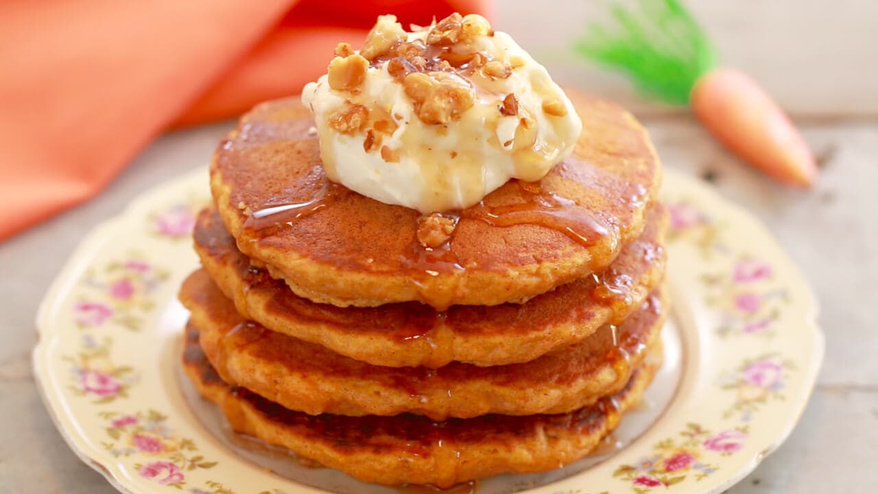 In a bowl, combine flour, nutmeg powder, baking powder, cinnamon powder, salt, and brown sugar. Whisk egg with milk and mix into dry mixture. Then, fold in carrots. Working in batches, heat oil in a skillet, and cook 2 tablespoons of batter on both sides for 2 to 3 minutes or until pancakes set and are golden brown. Transfer to a plate, top with whipped cream, swirl cream, swirl on honey.