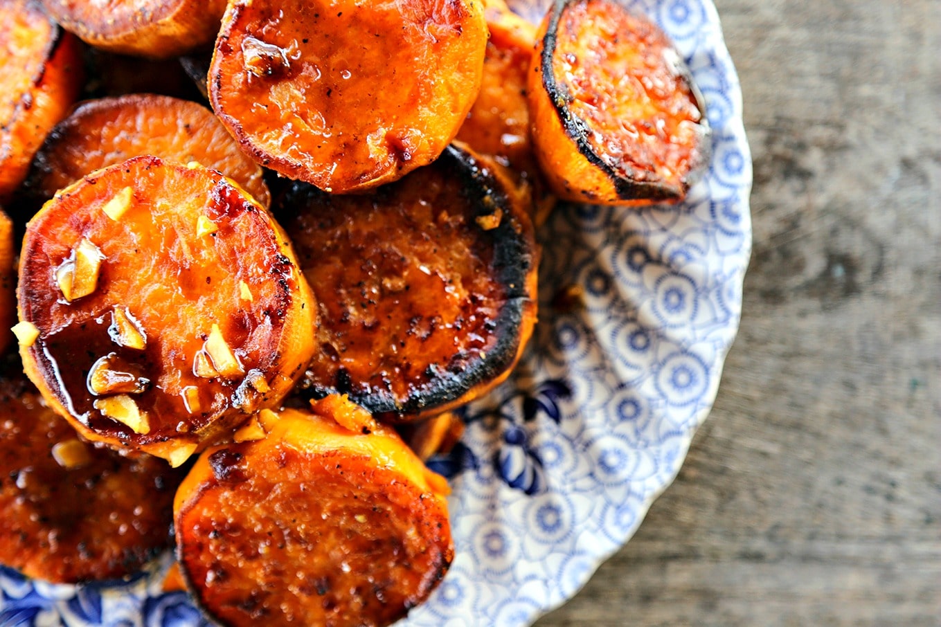 Preheat your oven to 425 degrees F. Toss the sweet potatoes in the melted butter and place them in a single layer on a baking sheet. Sprinkle the potatoes with salt and bake for 15-20 minutes, flipping halfway through cooking time. In a small saucepan over medium heat, bring the maple syrup to a simmer and then stir in the pecans and simmer for 2 minutes. Remove from heat. Place the cooked sweet potatoes on a serving and pour the pecan glaze over them. Serve immediately.