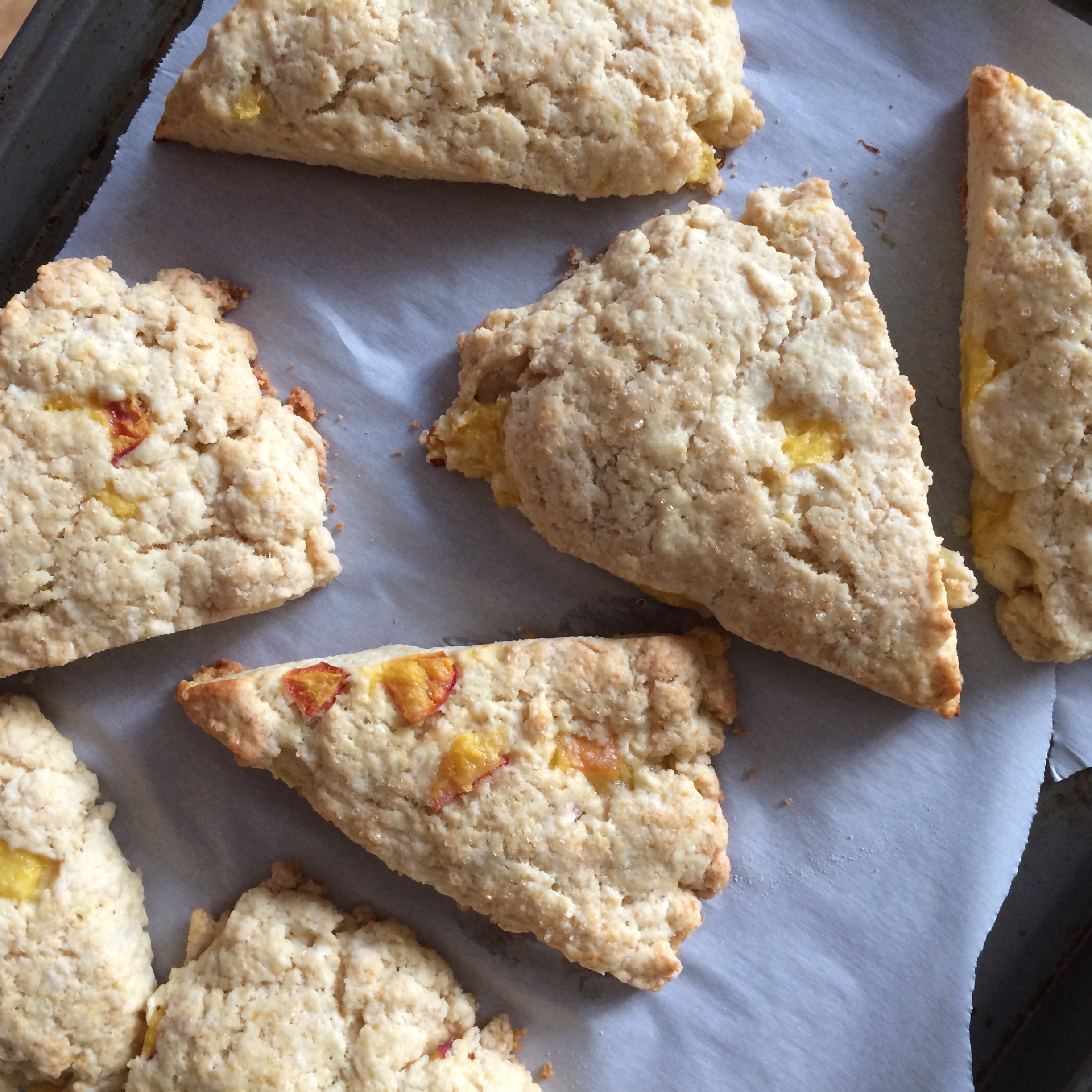 In the bowl of a stand mixer fitted with the paddle attachment, combine cake flour, sugar, salt, and baking powder on lowest speed. Gradually add butter, mixing on low speed until pea-size lumps form. Gradually add cream on low speed until the mixture just comes together. You may not need the entire amount. Add frozen peach slices and mix until just combined. Transfer dough onto a lightly floured surface. Gently pat dough to form a 12-inch square that is 1 inch thick. With a chef’s knife, cut dough into 3-inch squares. Transfer scones onto a parchment lined sheet pan with 1 inch of space between each scone. Press down on the center of each scone with your thumb to make a divot for the ricotta cream. In a medium bowl, use a rubber spatula to combine ricotta, vanilla bean seeds, sugar, and almond extract. Place 1 tablespoon of ricotta cream in the center of each scone. Garnish with a slice of peach set off to the side of the ricotta cream. Generously sprinkle sugar on top of the scones. Place in freezer to chill at least 1 hour before baking. Preheat oven to 375°. Bake 15 minutes, rotate pan, and continue baking until ricotta cream is golden brown and peach slices blister, about 15 more minutes. Cool 10 minutes and serve. Tip: To split a vanilla bean pod, take the tip of a paring knife and run it down the center. Split one end open and hold it down against a flat surface with thumb and index finger. Then take the blade of paring knife and scrape along the split pod to extract the seeds. As we note in the Mise en Place chapter, splitting beans is easier if you soak them in vanilla extract first a win win!
