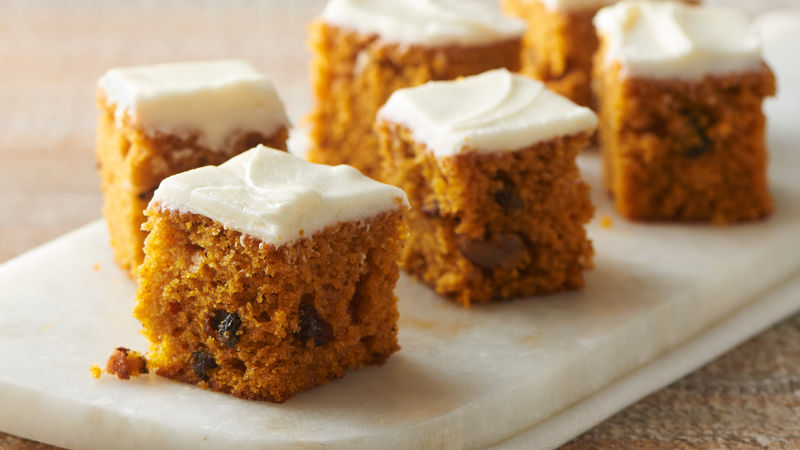 Preheat your oven to 350 degrees F and grease a 15×10 baking pan. In a small bowl, sift together the flour, baking powder, cinnamon, nutmeg, salt, and baking soda. In a large mixing bowl, combine the eggs, sugar, oil, and pumpkin until mixed well. Gradually mix in the dry ingredients and mix well. Spread the batter into the baking dish and bake for 25-30 minutes or until a toothpick inserted into the center comes out clean. While the bars are in the oven, place the cream cheese and butter in a mixing bowl and cream together. Add in the powdered sugar, whipped cream, vanilla extract,