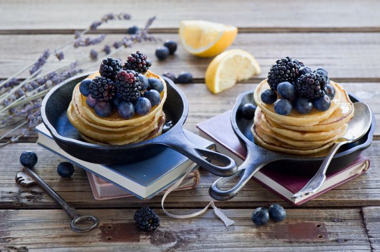 Heat to oven over medium fire meanwhile, in a blender crack the eggs and pour almond milk, vanilla extract and ricotta and mix it well. Then in another and ricotta mix it well. Then in another bowl mix all the dry ingredients and blend them in a blender real well. Then cut the berries in lengthwise halves and add them to the former mixture. Make sure some them later in the presentation. Now add butter in a pan over the medium heated oven and let it melt down. Then add the pancake batter over it and cook the pancake on both sides till they become light brown in color. Use maple syrup and serve the pancakes with milk!