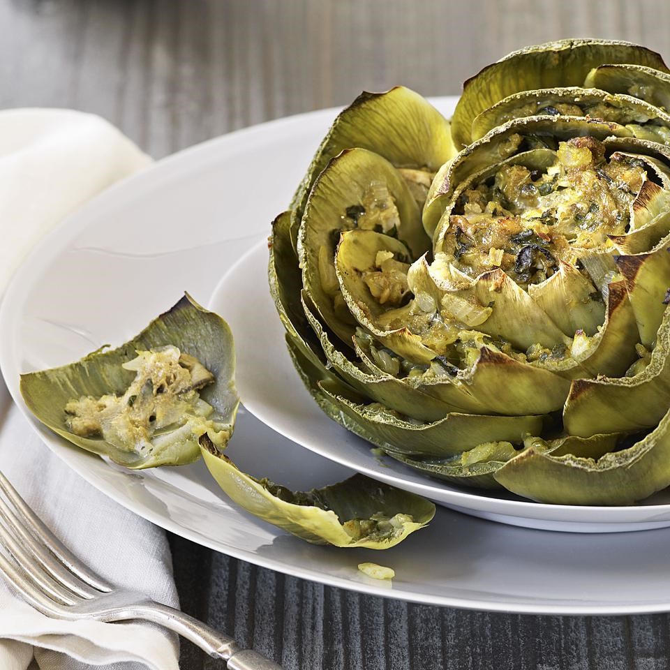 Coarsely crush croutons, if large pieces. In a large bowl combine croutons, sweet pepper, mozzarella cheese, and Parmesan cheese. Add anchovies, if using. In a small bowl combine olive oil, vinegar, oregano, salt and pepper; drizzle over crouton mixture. Toss to combine. Add enough chicken broth to moisten. Set aside. Wash the artichokes; trim stems and remove loose outer leaves. Cut off 1 inch from top of each artichoke; snip off the sharp leaf tips with kitchen scissors. Brush the cut edges with a little lemon juice. Whack the artichokes, point side down, on a countertop and the center will open to expose yellow center leaves and choke. If necessary, use your fingers to pull the outer leaves away from the center leaves. Use a spoon to scoop out inner yellow leaves and fuzzy center. Brush insides with lemon juice. Spoon the filling into the artichokes, packing lightly. Place artichokes, stuffing side up, in a 4 to 5 quart stainless steel or enamel coated Dutch oven. Add 1-1/2 cups water to pan. Bring to boiling; reduce heat. Cover and simmer for 25 to 30 minutes or until a leaf pulls out easily. Carefully remove with tongs.