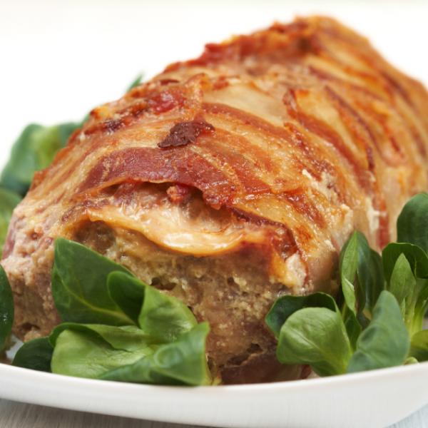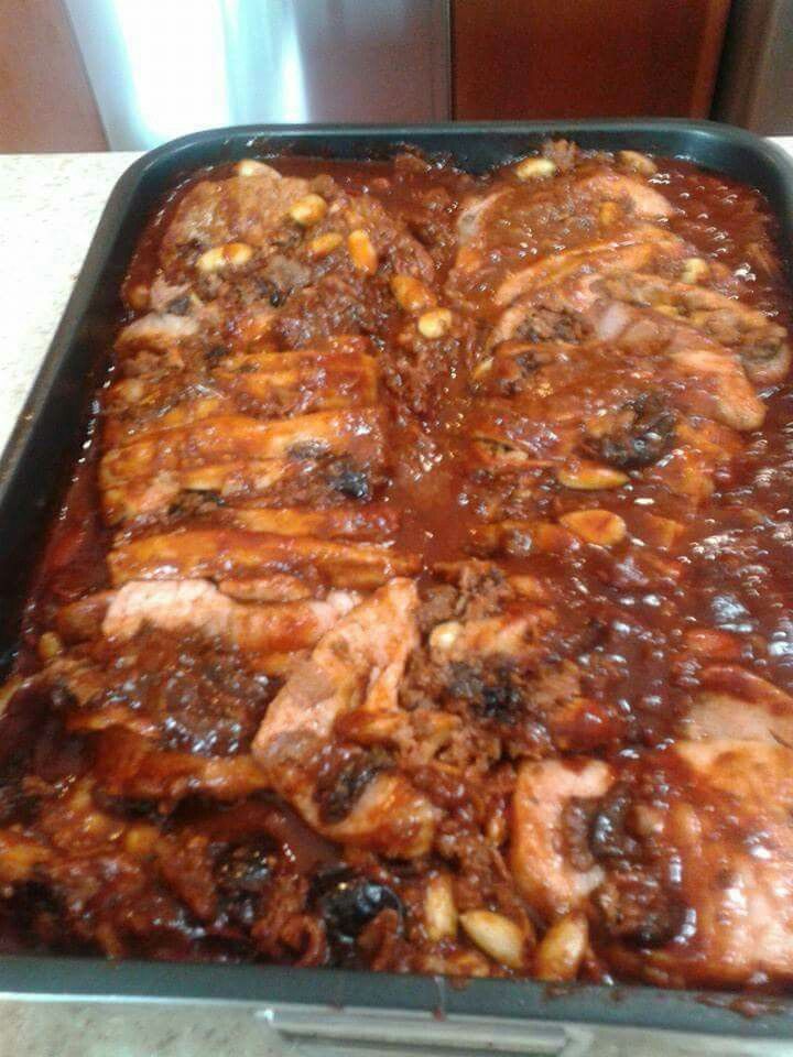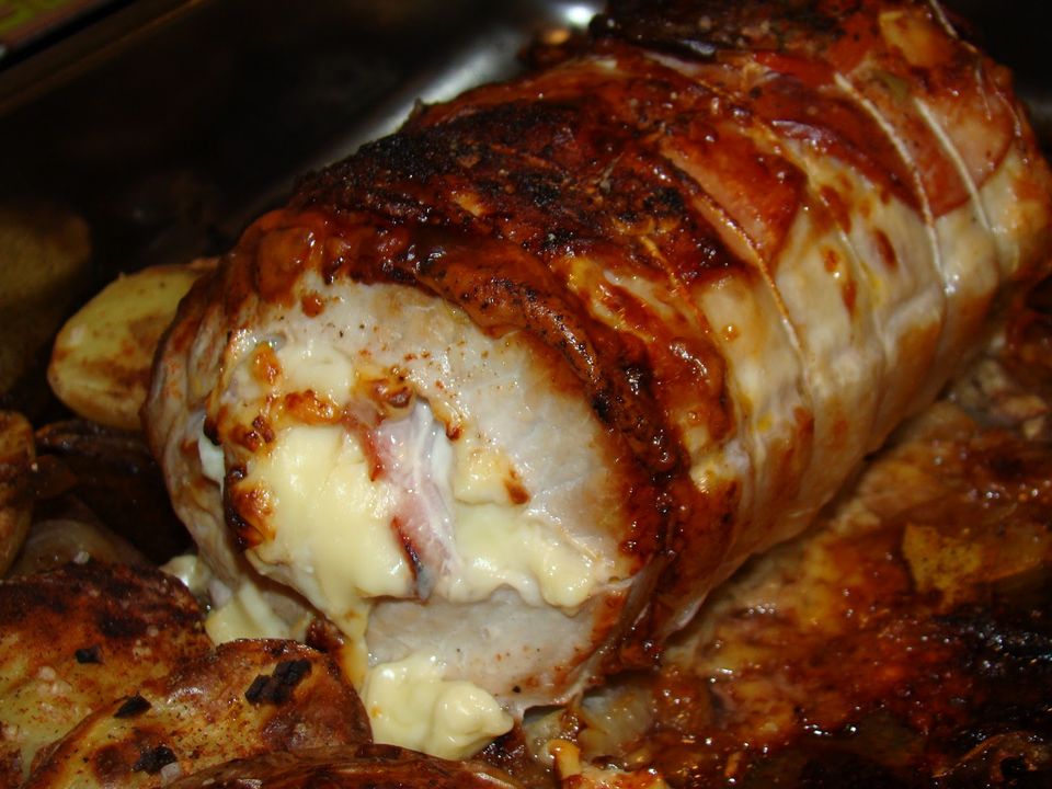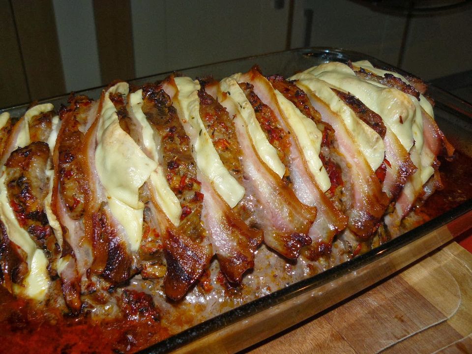 Juntar los ajos, la pasta de pimentón, el aceite de oliva y los condimentos. Mezclar bien. Envolver el lomo con esta carpeta y dejar reposar algunas horas. Llevar a asar en un tablero donde se pone el vino y un poco de agua. Cuando esté casi asado, cortar el lomo a las rebanadas, pero no cortar completamente hasta abajo. Poner una rodaja de queso y una de tocino en cada lugar de corte. Va de nuevo al horno hasta dorar el tocino y derretir el queso.