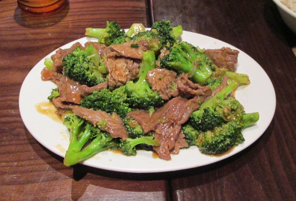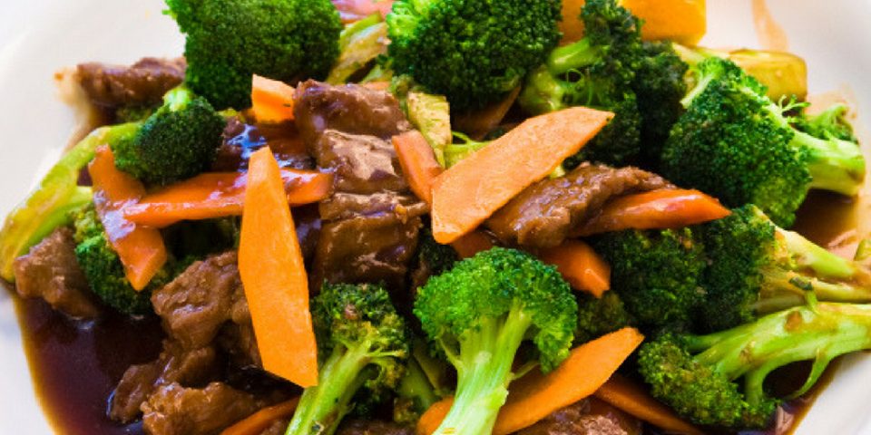 Hierve 2 litros de agua en una olla. Calienta el aceite en un sartén grande a fuego medio. Agrega el ajo y sofríe uno segundos, hasta que se vea transparente. Añade la carne y cocina, moviendo constantemente, hasta que empiece a cambiar de color. En ese momento pon el brócoli y la zanahoria en el agua hirviendo, y hierve sólo durante 30 segundos. Escurre muy bien estas verduras y agrega al sartén con la carne. Luego, incorpora la cebolla. Sazona el guiso con sal, azúcar, salsa de soya y salsa de ostras. Cocina, moviendo constantemente, hasta que todos los sabores se hayan integrado. Sirve y acompaña con arroz al vapor.